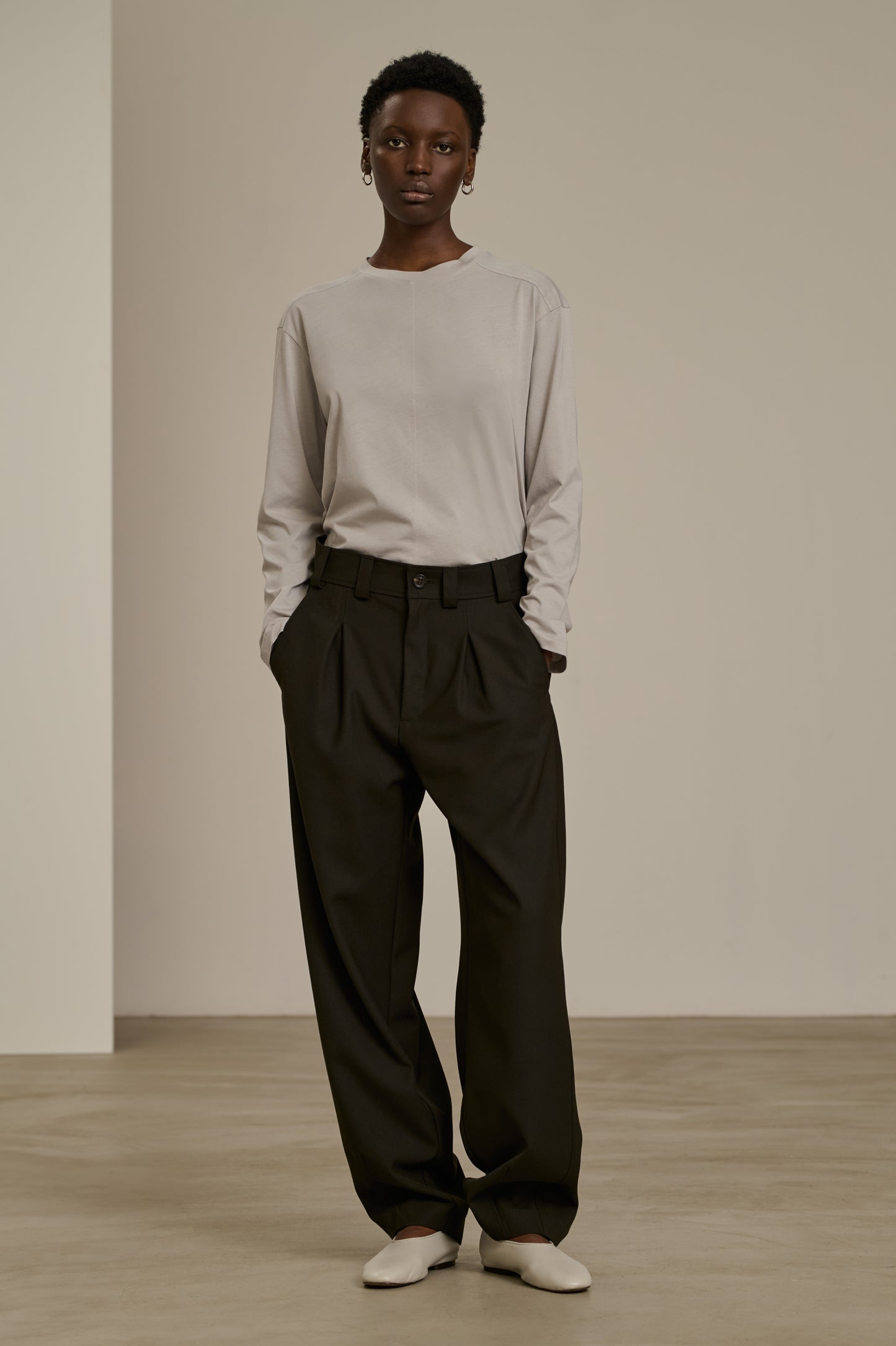 TIMON is a pleated trousers to be worn high-waisted with a belt and gathered, or low-waisted resting on the hips. It creates a controlled voluminous effect, paired with an oversized wardrobe. Match it with the TIMON trousers for a complete autumn look in wool gabardine.